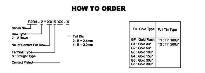 Products Female Header 1.27mm F204 Dual Row 04 to 100 Contacts Straight Type 0.05” × 0.1” (1.27 × 2.54mm) Female Header Dual Row 04 to 100 Contacts Straight Type Profile : 4.6mm Specification: Current Rating : 1Amp Insulator Resistance : 1000 Megohms min. Contact Resistance : 20 Milliohms Max. Dielectric Withstanding : AC 500V Operating Temperature : -40°C ~ +105°C Max Processing Temp : 230°C For 30~60 Seconds (260°C For 10 Seconds) Contact Material : Phosphor Bronze Insulator Material : Polyester, UL 94V-0 Standard : Nylon-6T Contact Plated : Full Gold, Full Tin F204-2*XXSXX-X(PDF) Please write down your comment on this product, and click Add to Inquiry List for inquiry Add to Inquiry List Review Inquiry List Back